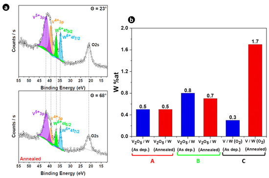 - Sawatzky, G.A.; Post, D. X-Ray Photoelectron and Auger Spectroscopy Study of Some Vanadium Oxides. Phys. Rev. B 1979, 20, 1546–1555. [Google Scholar] [CrossRef]