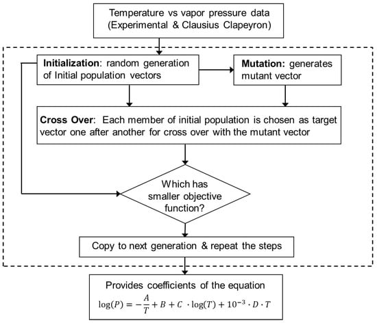 The overall structure of this work. Data collected from experimental work and synthesized using the Clausius Clapeyron equation is fed to a differential evolution genetic algorithm (GA) to provide the coefficients A, B, C, and D of the vapor pressure relation. The dotted box indicates the GA algorithm.