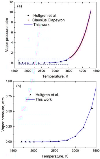 The vapor pressures of elements at various temperatures are important for a wide range of scientific and engineering calculations [1,2,3,4,5,6]. Vapor pressure data are important for many metal processing operations and properties of many alloys. They are needed to predict the loss of alloying elements due to vaporization during additive manufacturing and fusion welding and for the deposition of various thin films of commercial interest [1,2,3,4,5,6]. In the keyhole mode welding and additive manufacturing processes, the relationship between temperature and vapor pressure is a requisite to predict the shape, size, and stability of the keyhole [7]. Similarly, in the pyrometallurgical production of metals, vapor pressure and the rates of evaporation of zinc and cadmium are used in the final refining steps of their extraction [8,9]. Accurate knowledge of the vapor pressure is necessary to have a vapor coating of elements [10]. In high-pressure systems such as nuclear reactors, the choice of coolants like liquid sodium or alloys of sodium-potassium and lead-bismuth is affected by their vapor pressures [11]. Therefore, an accurate database of vapor pressure for elements is needed for different scientific and technological applications.