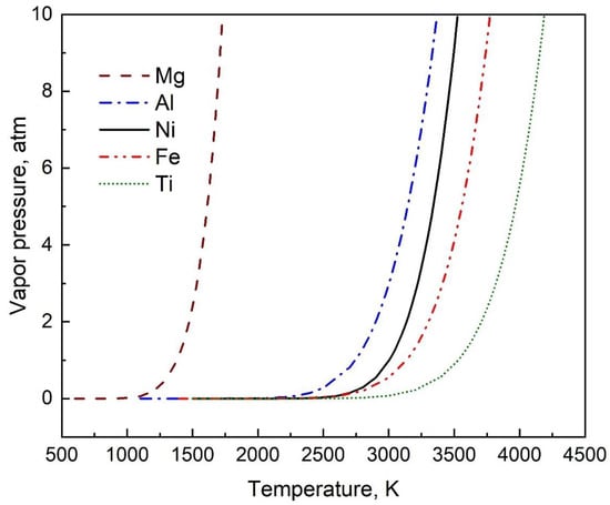The variation of vapor pressure with temperature for five commonly used elements of Mg, Al, Ni, Fe, and Ti are obtained using the coefficients generated from this study (Table 2) and is shown in Figure 3.