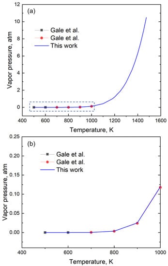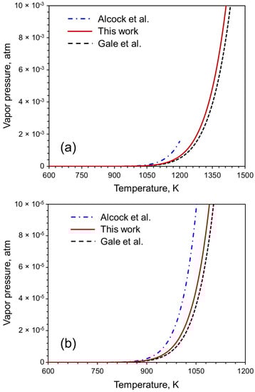 The reliability of our proposed equation of vapor pressure can be evaluated by comparing the vapor pressure values computed using our equation with the vapor pressure values in the literature. The calculated values of the vapor pressure of Pb (Figure 8) are compared with those computed using the coefficients provided by Alcock et al. [13] and Gale et al. [14]. The data are available between 600 K and 1200 K in Alcock et al. [13]. and from 600 K to 2030 K in Gale et al. [14]. The coefficients are valid between 600 K and 2600 K. Figure 8 shows that our data is within the range of the data available in the literature. Therefore, our data is reliable as well as covers a wider range of temperatures that is not currently available in the literature.