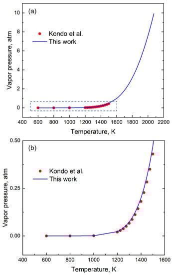 (a) A Comparison of the vapor pressure of Li using coefficients generated using our method (GA) and that of Kondo et al. [22]. (b) The enlarged section of the vapor pressure data between 400 K and 1600 K shows the good fit with the equation.