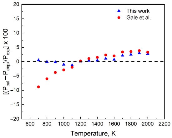 Table A1 indicates the difference between the experimental data [12] and the fitting results in Figure 2 between 1700 K and 3400 K. The coefficients A = 17,250, B = −15.97, C = 6.403 and D = −0.5281 shown in Table 2 are used in Equation (2) to generate the fitting results. A good agreement between the experimental data and the fitting results is observed.