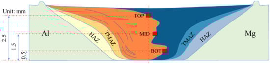Electron probe microanalysis (EPMA) was carried out to characterize the distribution of elements at the interface. Since the intermetallic compound is thick in the upper and middle parts of the weld nugget zone while the size of the FIB sample is about 6 μm × 7 μm, the observation location was selected at BOT in Figure 3, the lower part of the weld where the intermetallic compound is relatively thin. This can cover the aluminum/magnesium matrix as much as possible on the basis of photographing the intermetallic compound.