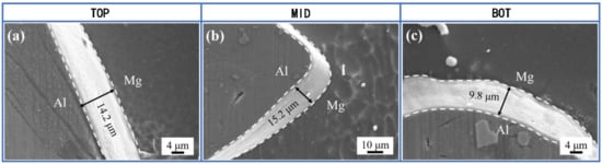 As schematically illustrated in Figure 3, three positions located at the top, middle and bottom regions in the weld nugget zone (WNZ) at the transverse cross-section of a dissimilar weld were selected for SEM characterization. Figure 4 shows the SEM images of intermetallic compounds (IMCs) at TOP, MID, and BOT, and the IMCs thickness was 14.2 µm, 15.2 µm, and 9.8 µm, respectively. When compared to those in the AA6061/AZ31B joint with corresponding data of 1.6 µm, 7.7 µm, and 1.7 µm [24,25], the IMCs thickness in the AA2024/AZ31B joint is much larger.