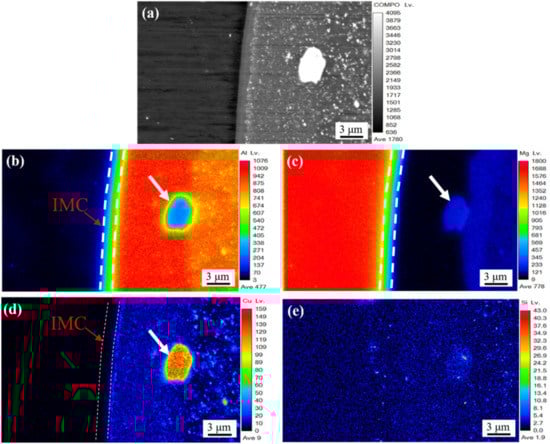 Figure 5 presents the EPMA measurement result on Al/Mg bonding interface in the FSW weld. It can be seen from Figure 5b and c that there is a composition transition of aluminum and magnesium in the intermetallic compound layer, which indicates the existence of double-layer IMCs. However, it is difficult to find this in the SEM image in Figure 4. Figure 5d shows that a large amount of copper exists in the strengthening phase S-phase Al2CuMg, as shown by the white arrow in the figure. The element segregation of copper gathers at the boundary of the IMC layer, forming a fine Cu strip. It can be seen from Figure 5e that the Si element mainly exists in the position of small-sized reinforced phase particles of AA2024 aluminum alloy, and it is generally characterized by dispersion distribution.