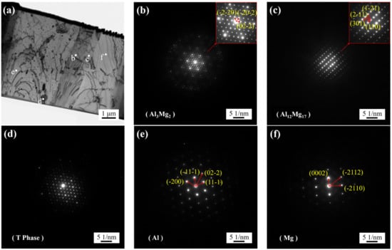 Figure 7 shows the diffraction pattern of the FSW joint. Figure 7b–f, respectively, show the diffraction patterns at the locations of the white marks in Figure 7a. By calculating the interplanar spacing and angle and comparing with the standard diffraction pattern, it can be determined that Figure 7b corresponds to Al3Mg2 with face-centered cubic structure, Figure 7c to Al12Mg17 with body-centered cubic structure, Figure 7e to Al with face-centered cubic structure, and Figure 7f to Mg with close-packed hexagonal structure. Figure 7d shows the diffraction pattern of the strengthening phase T-phase.