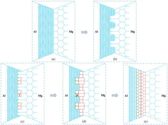 In the process of continuous growth of γ-phase Al12Mg17 into Mg grains, when it consumes enough Al atoms in Mg grains, it will stop this phase transformation mode with less energy consumption. At the same time, at elevated temperatures, γ-phase will not only grow up through the diffusion of atoms but also grow out into the Al matrix, and Al atoms will diffuse into γ-phase grains violently. According to the binary phase diagram of Al-Mg [12], with the decrease in temperature, part of the β phase will precipitate at the grain boundary of the γ phase. Because there are many defects at the grain boundary of the γ phase near the Al side, at the same time, more strengthening phase particles will promote the phase transformation nucleus, and it is easier to reach the grain boundary formation energy of phase transformation so that the phase transformation nucleus will occur. Because more Al atoms diffuse into the protruding part of the γ-phase grain, it is easier to reach the atomic ratio required by β-phase Al3Mg2, and there are more Al atoms in the γ-phase grain, so the newly formed β-phase Al3Mg2 will preferentially grow into the γ-phase grain. At the same time, the γ-phase is transformed into the β-phase, and the γ-phase in other positions still bulges and nucleates at grain boundaries, as shown in Figure 8d. During the continuous growth of intermetallic compounds to the Al side, the particles of the strengthening phase will be squeezed to the side of the β phase continuously, which leads to a large aggregation of strengthening phase particles between the β phase and Al matrix. This will promote the nucleation of the β phase and facilitate the growth of intermetallic compounds.