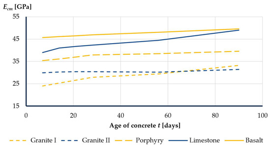 The modulus of elasticity of concrete with the use of various aggregates over time.