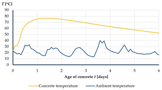 These curing conditions in the laboratory do not reflect reality. Firstly, the concrete in the superstructure, unlike the specimens in the laboratory, does not have access to an unlimited amount of water. At the construction site, there is only water in the amount specified in the concrete mix recipe. Secondly, the temperature of the concrete in the superstructure during the setting process varies over time and far exceeds the 20 °C that occurs in the laboratory [4,5]. The authors’ own research showed that in the summer months, the temperature inside the girder can reach up to 80 °C (Figure 2). The research presented in this article attempts to take into account the actual curing conditions occurring in the superstructure at the construction site and examine their effect on the mechanical properties of concrete.