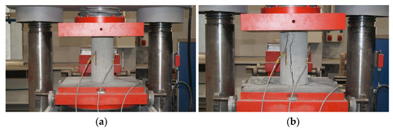 For the analysis of the concrete mechanical properties, a minimum of 24 cylindrical specimens with a diameter of d = 150 mm and a height of h = 300 mm were prepared [23]. Half of them were cured under standard conditions in water, while the other half under structure conditions in the laboratory oven. The tests of the modulus of elasticity of concrete were carried out on a class 1 compression testing machine [26]. The change in stress in the concrete was recorded with sampling every 0.2 s. Deformation measurement was carried out along three lines arranged on the sidewall every 120° [24] with sampling as for stress recording (Figure 6).