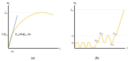 Method A, according to the standard [24], was used to determine two values for the secant modulus of elasticity: the initial modulus Ec,o and stabilized modulus Ec,s. The specimens are subjected to cyclic loading and unloading, as shown in Figure 7. For the calculation, the formulas used were