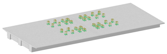 Numerical analysis of the superstructure was performed using the FEM program. The main girders were modeled using beam elements, while the deck slab and cross beams were modeled using shell elements (Figure 11).