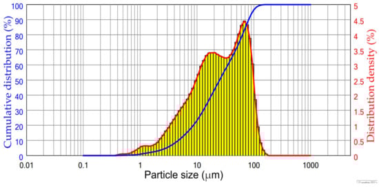 The CFA used in this study was collected from the Reftinskaya TPP in Asbest, Russia. This plant uses pulverized furnace for coal combustion at temperatures higher than 1100 °C. The particle size distribution of the raw CFA is shown in Figure 1. The chemical composition of the CFA is shown in Table 1. According to Table 1 and Figure 1, the raw CFA has a typical CFA class F composition with a high amount of SiO2 (>60%) and a low amount of Al2O3 (<30%). The median particle size of the CFA was about 25 μm. Before leaching experiments, the CFA was subjected to magnetic separation based on a procedure described elsewhere [33]. The NaOH leaching process used to obtain DCFA was carried out according to our previous research [29] at T = 110 °C, L/S ratio = 10, 11.6 mol L−1 of NaOH, and a leaching time of 25 min.
