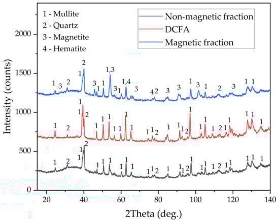 The chemical compositions of the magnetic fraction, non-magnetic fraction before desilication, and DCFA are shown in Table 2. The X-ray diffraction pattern of the non-magnetic fraction and DCFA, as well as magnetic fraction samples, are shown in Figure 2. The mineral composition of CFA (non-magnetic fraction) includes quartz (SiO2), mullite (3Al2O3·SiO2), and an amorphous glassy mass (from 20° to 50° 2θ). After desilication, an amorphous glassy mass was completely dissolved, as confirmed by the XRD pattern of DCFA. The main crystalline phase of the magnetic concentrate is magnetite (Fe3O4). However, there is also a high amount of mullite and quartz. These phases may be included in the solid matrix of the magnetite or physically entrapped within the concentrate. The chemical composition of the magnetic fraction confirms this, with a high amount of SiO2 and Al2O3 seen. Nevertheless, the content of Fe2O3 in the concentrate is four times higher than in the raw CFA. The yield of the magnetic fraction is 8.5 wt.%. The chemical compositions of the non-magnetic fraction are almost identical to those of the CFA except for iron content, which was reduced from 3.43 wt.% to 1.58 wt.%.