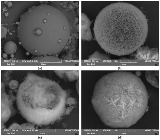 To demonstrate the reason for these differences, the SEM images of the raw CFA and DCFA are provided (Figure 3). The CFA is presented by smooth spheres of mullite covered by glassy mass. After desilication, spherical agglomerates of acicular mullite particles with high porosity can be seen in DCFA. In the magnetic concentrate, there are magnetite spheres composed of crystals with an orientation along an axis.