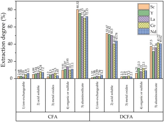 After the precipitation of REEs from alkaline solutions, the proportion of acid-soluble phases should be expected to increase. To investigate the distribution of REEs in CFA before and after NaOH leaching, a sequential chemical extraction procedure [15] (Figure 5) was conducted. The NaOH leaching helps to increase the amount of acid-soluble phase by dissolving the aluminosilicates phases. However, the achieved results are lower than those obtained using PCB fly ash and standard desilication after 2 h or more [37,38,39]. Another contributing factor to the higher extraction from DCFA is the higher specific surface area of the particles (Table 3).