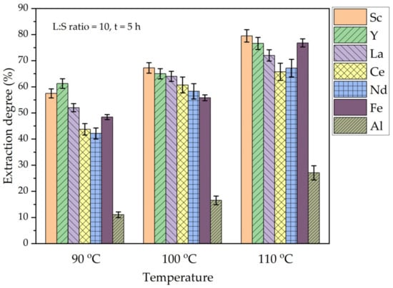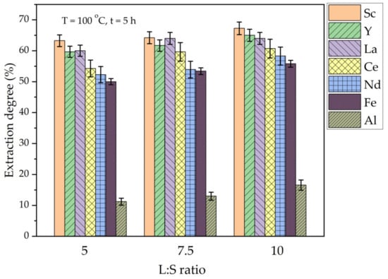 Figure 7 shows that an REEs extraction more than 50% was achieved at all the L/S ratios after 5 h of leaching at 100 °C. However, the Al extraction was lower than 20% at these conditions. The increase in the L/S ratio from 5 to 10 leads to an increase in the extraction of all the elements by 5–7%. Therefore, the L/S ratio has a little effect on the REEs extraction from DCFA under atmospheric pressure. To enhance the extraction of Al, the high-pressure leaching method commonly is used [42], which implies a high effect of temperature on the mullite leaching.