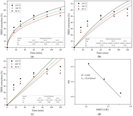 Equation (3) is used to describe the process that is limited by the intraparticle diffusion through the solid product of the chemical reaction. Equation (4) is used to describe the process being limited by the surface chemical reaction, and Equation (5) is used to model the process limited by the diffusion through the liquid film (external diffusion). If the experimental data are better fitted to one of these equations, it means that this stage is a preferable limiting step of the process. The results of the effect of leaching time and temperature on the total REEs extraction (the sum of Sc, Y, La, Ce, and Nd extracted, TREE extraction) and the fitting of the data to the shrinking core model are shown in Figure 9.
