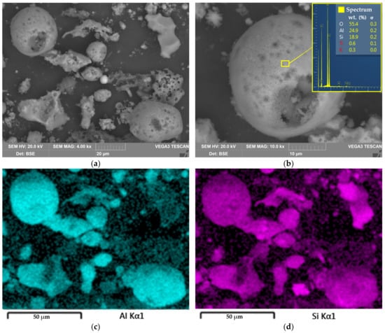 The SEM image of the solid residue particles surface at 4000 magnitude (a); the SEM image with EDX spectra of the mullite agglomerate at 10,000 magnitude (b); elemental distribution of Al on the surface of particles on Figure 10a (c); elemental distribution of Si on the surface of particles on Figure 10a (d).