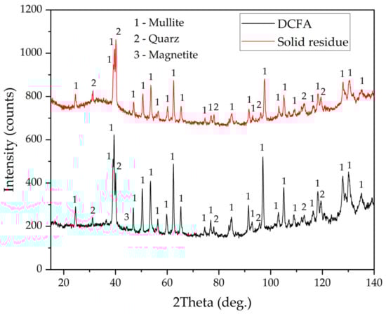 Furthermore, Figure 10c,d indicate that there are Al-depleted particles. These particles can be presented by quartz or precipitated amorphous silica, which formed during silicic acid hydrolysis [36]. The presence of amorphous silica can be confirmed by the XRD pattern of the solid residue, which is shown in Figure 11. After leaching, an amorphous phase can be seen from 20° to 50° 2θ. Additionally, the peaks of mullite after leaching were lowered, while the peaks of quartz became higher.