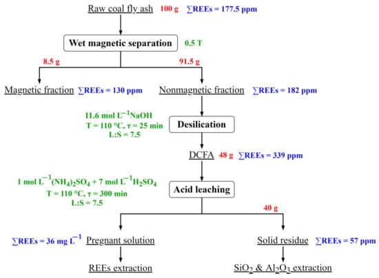 Taking into account the obtained results, the following flowsheet of the REEs extraction from the CFA after desilication is proposed (Figure 12).