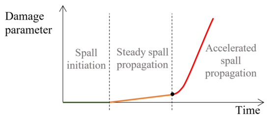 Spall formation is caused by rolling contact fatigue (RCF). This is a microscopic mechanism during which micro-cracks can propagate in two different ways: (1) near the surface, originated pitting [1,2] and (2) sub-surface, originated spalling, until metallic flakes are released from the surface of the bearing raceways and/or the REs [3,4,5,6,7]. Sub-surface cracks mostly generate at stress concentration sites such as non-metallic inclusions, which causing “butterfly wings” in the vicinity of inclusions [8,9,10]. Improper installation of a bearing, or a lack of lubrication, along with the operating conditions (load, speed, and temperature) can also cause for pitting and spall formation which affect the system vibration [11,12,13,14] and eventually affect the fatigue lifetime of the bearing [15]. The spall evolution in the raceways is divided into three stages as shown in Figure 1: (1) initiation of the spall by the RCF mechanism, (2) steady spall propagation, and (3) accelerated spall propagation until final failure. After crossing the transition between the second and third stages, the deterioration of the bearing is uncontrollable and eventually will lead to catastrophic failure. Several studies have proposed methods to estimate the bearing lifetime under RCF [15,16,17,18,19,20,21,22,23]. Fracture mechanics approach has been used to model the RCF [24,25,26,27,28,29]. In addition, models have been developed to investigate the microstructure and the stochastic nature of RCF [30,31,32,33]. However, it is to be emphasized that even after the first spall formation, the bearings might be fully operational for additional millions of cycles. Therefore, it is important to investigate the damage evolution mechanisms that control the steady spall propagation stage and to identify the state of the bearing before it reaches the rapid spall propagation. Even though the spall propagation process and what affects it have been widely studied, it is still not fully understood. Several studies attempted to quantify the spall growth mechanism, such as Arakere et al. [34] and Branch et al. [35,36], who presented a 3D elastic-plastic finite element (FE) model to investigate the stress and strain fields in the neighborhood of the spall’s edge induced by the RE’s impact onto the spall’s trailing edge. The simulation results of the FE model are supported by experimental results. Arakere et al. [34] indicated that the stress field around the spall edge confirms extensive yielding and spreading of the spall, first axially (across the width of the raceway), until the RE descends into a spall. Branch et al. [35,36] found that tensile residual hoop stress appears on the spall’s edge after the RE–spall impact, which encourages fatigue crack initiation and growth. Gazizulin et al. [37] suggested a simpler quasi-static 2D plane-strain FE model for the interaction between the RE and spall edge. The simulation results are in a good agreement with those obtained in [34,36].