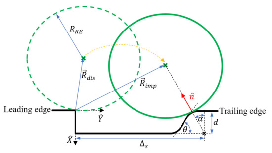 For a description of the interaction between the RE and the spall edge, a validated rigid body dynamic model [33] was used to calculate the impact force between the RE and spall trailing edge and the RE–spall impact location. The dynamic model developed by Kogan et al. [33] was geometrically modified by Gazizulin et al. [32], from the sharp edge of the trailing edge of the spall to an oblique edge to represent a more realistic spall edge. It estimates the first RE–spall impact location, , (Equation (1)), referring to a Cartesian coordinate system centered at the leading edge (see Figure 2 where all geometric parameters are shown). It also estimates the normal contact load, , between the RE and spall trailing edge during their interaction (Equation (2)).