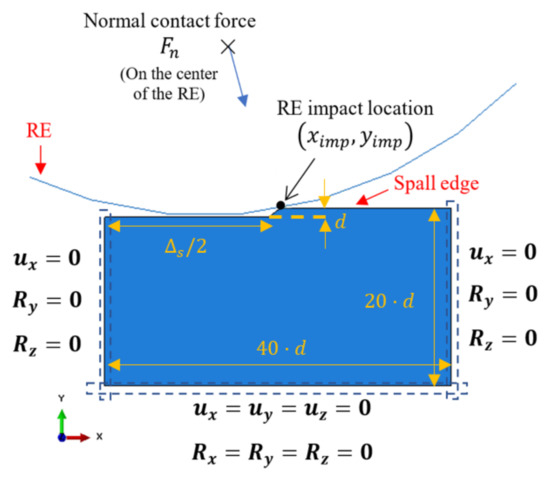 A quasi-static 2D plane-strain FE model was constructed with an ABAQUS/standard solver to describe the interaction between the RE and spall edge. The model was validated based on the work in [35,36]. Additional details about choosing a solver and model validation can be found in [37]. The model assumption is that the size of the defect is relatively small: the RE does not hit the bottom of the spall, i.e., the RE hovers over the spall, and only one RE is in interaction with the fault at a time.