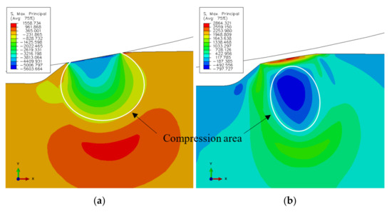 The simulated stress state at the spall edge upon loading and unloading of the RE–spall is presented in Figure 4a,b, respectively. In Figure 4a, where the normal contact load, , reaches its maximum value, the spall edge is under compression stresses. Under these conditions, cracks are unable to initiate and propagate within the spall edge. However, due to the plastic deformation at the loading stage, in the unloading stage, where the normal contact load is reduced to zero, the stresses in some areas of the spall edge turn to tension. Thus, repeating the loading and unloading can lead to the appearance of cracks (Figure 4b). There is still a large area which is under compression stress. Understanding the spall mechanism requires understanding the behavior of displacements, and strain and stress fields. These are presented at the loading stage in Figure 5. The horizontal displacement (Figure 5a) is divided into an area with displacements in the positive x direction and adjacent area with displacements in the negative direction. However, the surrounding material disabled the movement, and a compressive stress appeared in the spall edge (Figure 5b). The strain fields in the horizontal and vertical directions during the loading stage, are presented in Figure 5c,d, respectively. An area with horizontal positive strain appears in the center of the spall edge (Figure 5c), and an area with vertical positive strain appears on the edges of the spall (Figure 5d). This implies the possibility of vertical crack propagation on the trailing edge of the spall and horizontal cracks from the sub-surface of the spall, despite the existence of the compression stresses. The residual stresses in the horizontal and vertical direction, after the unloading stage, are presented in Figure 6. In the horizontal direction (Figure 6a), tensile stresses are obtained on top of the trailing edge, and compression stresses are obtained deeper in the material. During the loading stage, the deeper (blue) area is subjected to tensile stresses, causing plastic deformation in the horizontal direction. After the unloading stage, the surrounding areas, which were subjected to elastic deformation, are able to return to the initial position, therefore, causing pressure on the area with the plastic deformation. Conversely, because the plastic area causes tensile stresses in the surrounding areas, residual tensile stresses evolve close to the spall trailing edge surface. The reason that there are no high tensile stresses that develop below the compression area (blue area) is that the stresses are divided over a larger area. The residual tensile stresses that evolve in the trailing edge can cause crack propagation across the trailing edge. This result agrees with the crack locations seen around the spall edge (see Section 3.2). The maximum residual tensile stresses in the vertical direction are obtained in the region of the free edge of the spall, as can be seen in Figure 6b. As explained earlier, this phenomenon can explain the progression of sub-surface cracks in the horizontal direction, which start from the free edge, as observed in the experimental results (see Section 3.2).