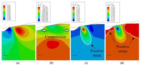 Simulation results of the (a) displacements in the horizontal direction x, (b) the stress , (c) the strain and (d) the strain at the maximum normal contact load, .