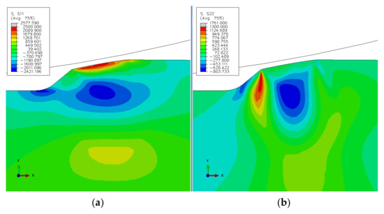 Simulated residual stresses (a) in the horizontal direction x, and (b) in the vertical direction y, in the unloading stage.