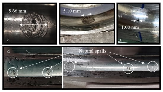Pictures of spalls in three different experiments: (a,b) Examples of spalls from the endurance test and (c) the disassembly and reassembly test. (d) Examples of several in-service spalls that appeared in a Sikorsky CH-53 helicopter swashplate bearing.