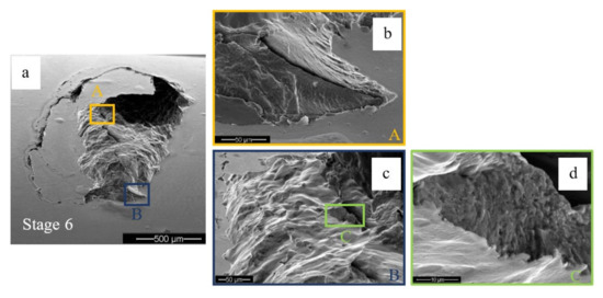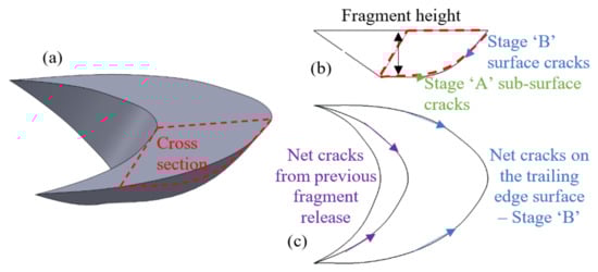 The estimated shape of the fragment is illustrated in Figure 20. The net cracks evolve on top of the trailing edge and downwards into the sub-surface (Stage “B”), forming the fragment shape (Figure 20b,c). The shape of the fragment also depends on the previous fragments released by net cracks. The sub-surface cracks (Stage “A”) approach the trailing edge cracks and eventually cause the fragment release (Figure 20b). The height of the fragment is less than the location of the maximum shear stress in the material, which gives rise to the appearance of a microcrack in the spall initiation process [34,41].