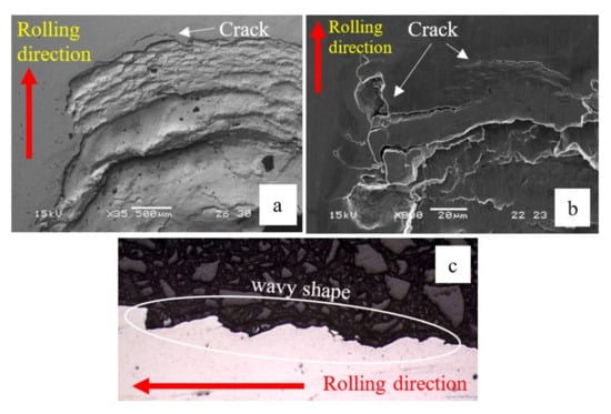 Cross-sections parallel to the rolling direction are presented in Figure 12 and Figure 13. They show a wavy “inclined steps” pattern, at the bottom of the spall. Surface and sub-surface cracks can be clearly seen in Figure 12a,b and Figure 13.