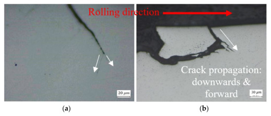Crack propagation (a) into the material depth, and (b) towards the rolling direction. The white arrows represent the direction of cracks propagation.