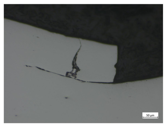 The repeated loading of the REs on the defect edge led to the formation of surface cracks, propagating in the deformed surface regions at the trailing edge of the bore [40]. Based on the simulation results in Section 2, sub-surface cracks were expected to appear on the trailing edge, in addition to the surface cracks. In this section, the findings from the experiments are presented.
