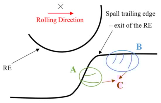 Based on the experimental observations, spall propagation can be envisioned as a three-stage process, schematically illustrated in Figure 19. In Stage “A”, sub-surface cracks appear underneath the spall trailing edge. In Stage “B”, cracks appear in front of the trailing edge of the spall, and in Stage “C”, the cracks propagate until a fragment is released from the raceway. It is noteworthy that there is no clear experimental evidence, based on our experimental results and on the literature, as to which stage starts earlier, cracks of type “A” or “B”.