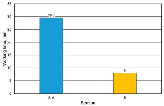 The experiments were carried out in two seasons of the year, in spring, when the ambient temperature ranged from 10.8–11.7 °C, and the relative humidity varied within the range of 37.3–43.4%, and in summer, when the ambient temperature was recorded in the range 27.7–28.9 °C, and relative humidity 35.2–38.6%. Since in the spring weather conditions in Central Europe (Poland) are similar to autumn weather conditions, the designations spring-autumn—S-A and summer—S have been introduced in the graphs for individual seasons.