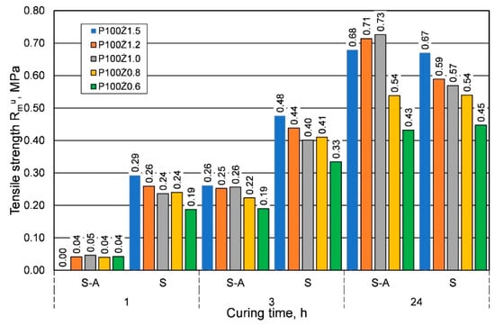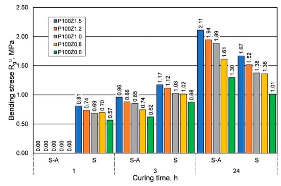 The tensile strength and bending strength of the hardened samples were determined according to the PN-83/H-11073 standard. Measurements were carried out on a universal apparatus to determine the strength type LRu-2e by Multiserw-Morek after three hardening times (compacted samples left for setting): 1, 3, and 24 h. At each curing time, the strength was measured on three pieces, and the results presented in the graphs are the arithmetic mean of these measurements.