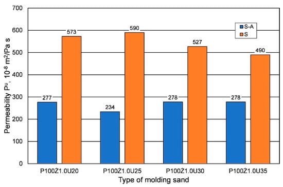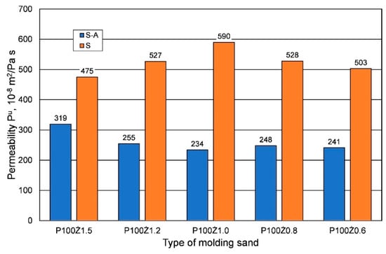The permeability of in the hardened state was determined according to the PN-80/H-11072 standard. Measurements were made using a fast method on the LPiR-1 apparatus manufactured by WADAP Wadowice. The hardened cylindrical sample was fixed in a special sleeve with an inflatable rubber gasket inside, pressed against the side surface of the sample with compressed air using a hand pump. The permeability for each molding sand was determined on three pieces cured for 24 h, and the results presented in the graph are the arithmetic mean of these measurements.