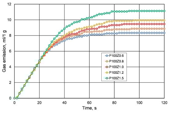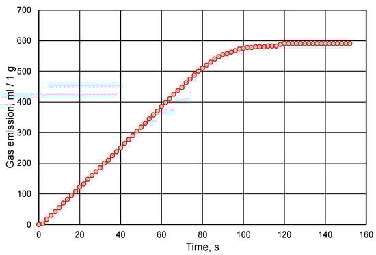 When looking for the optimal composition of the molding sand, with regard to the amount of resin and hardener, one should follow the rule that the less organic binder in the sand, the better. The high content of organic compounds in the molding sand is degraded or destroyed as a result of contact with liquid metal, causing the formation of gases in the mold cavity, which in turn affects the quality of the castings [,]. Therefore, an analysis of the amount of gases emitted was carried out. Figure 7 shows an exemplary analysis of gas emissions from the bound binder with a share of 25% of the hardener in relation to the resin. This result is a reference point for the emission of gases from the tested molding sands. When resin and hardener constitute a small amount in the composition of molding sand, the amounts of released gases are lower. However, the amount of resin added to the prepared sand is significant, which is shown in Figure 8. The data presented in Figure 8 refer to the molding sands prepared in the summer.