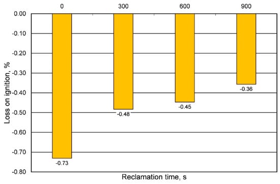 Chromite sand is an expensive material in the production of foundry molds. Therefore, its proper management is of great importance. Extending its useful life in the production process requires the use of a reclamation process. The grain matrix recovery process is in line with the current trend related to the so-called circular economy. Reclamation of used molding sand with organic binders can be performed using a mechanical or thermal method. Due to the widespread assessment that the thermal process is costly, the matrix recovery attempt was carried out using a mechanical method. To select the appropriate intensity of interactions, the process was carried out for 3 times: 300 s, 600 s, and 900 s. The quality of the reclaims obtained was assessed by determining the ignition loss. Figure 13 shows the results obtained for various periods of molding sand processing.