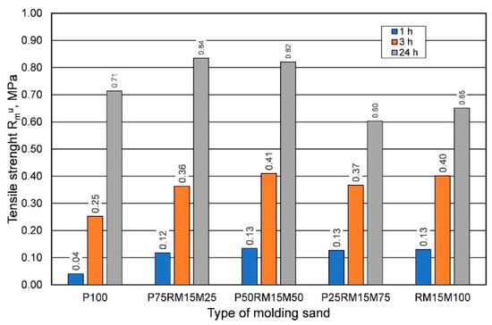 Taking into account the economic as well as the ecological aspect, the next step of the research was to determine the technological parameters of the molding sand with the use of reclaimed sand after 900 s of mechanical treatment (with the lowest loss of ignition, preferably cleaned of the used binder), in specific proportions to fresh sand. Research in this area was carried out in the spring. Figure 20 presents the results of tensile strength tests of the molding sand made on the basis of sand matrix, prepared with fresh sand and recovered mechanical reclaim in various proportions. Based on the results obtained, it was found that the addition of 25% and 50% did not worsen the tensile strength of the sand, but actually improved it.