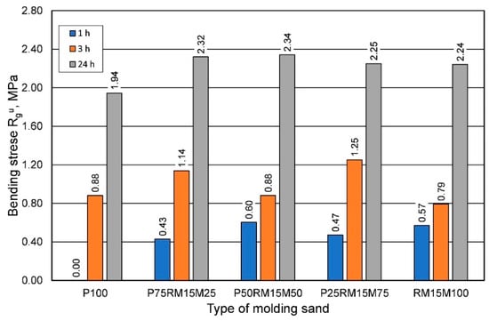 When comparing all parameters analyzed, to determine the best composition of the molding sand, from the point of view of weather conditions, sand quality, cost-effectiveness of the process and ecological aspect, it was found that the best is the molding sand with 100 weight parts of the grain matrix (in this case chromite matrix), 1.0–1.2% resin and 25% hardener in relation to the resin. The next step was to determine the effect of the amount of hardener added to the constant amount of resin dosed to the grain matrix. Figure 9 shows the results of the tensile strength tests, and Figure 10 shows the bending strength.