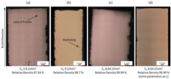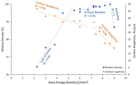 A similar trend line curve for relative density, as shown in Figure 1, was found by Jiang et al. [17] and Dadbakhsh et al. [20]. While the energy density threshold depends on the material to be processed, the three sections (Lack of Fusion, Process Window and Keyholing) and their trend with energy density are commonly found for all materials and AM technologies [21,22,23,24,25].