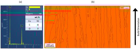Figure 3a shows the EDX spectrum for the samples printed with 8.64 J/mm2 (relative density 99.99%). Five EDX spectra were taken, and since all spectra are similar to each other, one representative spectrum was chosen. As can be seen from Figure 3a, mostly Cu was detected. Up to 8 wt.% carbon is shown. Carbon with an atomic number below 11 can be detected with EDX, however, it cannot be accurately quantified. The epoxy resin, in which the Cu samples were embedded, contains carbon fibers to ensure electric conductivity within the SEM. The detected carbon is therefore from the epoxy resin, rather than from the Cu samples themselves. Oxygen was not measured. No precipitations formed that could have affected the mechanical or electric properties. The EBSD-phase analysis in Figure 3b further confirms that no impurity phases formed at the measured scale that could negatively affect electric conductivity. All grains show the same phase. Similar results are found for samples with EA 4.5 J/mm2, 7.57 J/mm2, 7.7 J/mm2 and 8.64 J/mm2.