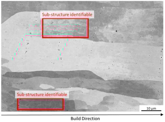 An SEM-image for a cube manufactured with EA 4.5 J/mm2 (relative density > 99.5 %) is shown in Figure 4. Oriented grains similar to those shown in Table 3 with some small pores can be seen. A grain sub-structure can be identified, which is similar to that reported by Ramirez et al. [28]. The sub-structure was attributed to Cu2O, which was measured at a finer scale than used in this study. The sub-structure shown in Figure 4 is possibly due to the powder oxygen content (see powder characterization above) or additional oxygen uptake during the recycling process that could not be resolved using EDX analysis. TEM analysis is necessary to confirm the presence of Cu2O. The sub-structure was also found for higher energy densities.