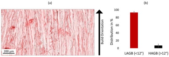 Figure 5a shows the grain boundaries for an EA 8.64 J/mm2 sample. The black lines indicate angles greater than 10° (i.e., high angle grain boundaries—HAGB), and red lines show grain boundary angles below 10° (i.e., low angle grain boundaries—LAGB). Figure 5b shows the distribution of LAGBs and HAGBs in the EBSD scan of Figure 5a. It can be clearly identified that the amount of LAGBs dominates, compared to the limited number of HAGBs. Dislocation movement is facilitated in LAGBs, since LAGBs ensure coherency within the atom structure of the material. However, dislocations, similar to grain boundaries, act as a hindrance to electric conductivity. LAGBs, therefore, reduce electric conductivity due to increased dislocation mobility. Some grain boundaries show curvature, which can reduce the electric conductivity by up to 80% [29]. Straight grain boundaries are, therefore, preferred and can be achieved by increasing the overall build temperature, thereby increasing the thermal gradient.