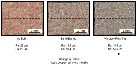 Figure 6 shows the effect of abrasive post-processing on the surface roughness of as built Cu samples. The surface roughness (Ra values) is reduced, compared to the as built condition, by up to 35%. The area surface roughness (Sa) shows similar results. Sand blasting and vibratory finishing remove sintered and partially molten particles from the sample surface, reducing the surface roughness. Compared to sand blasting, vibratory finishing improved the surface roughness by 7%. This can be attributed to the more aggressive collision of the polymer granulates on the surface, as well as the high frequency applied during vibratory finishing. The duration of the vibratory finishing process is also three times longer compared to sand blasting. However, all cubes were post-processed simultaneously during vibratory finishing, whereas each sample was individually sandblasted. The time efficiency of vibratory finishing should also be considered.
